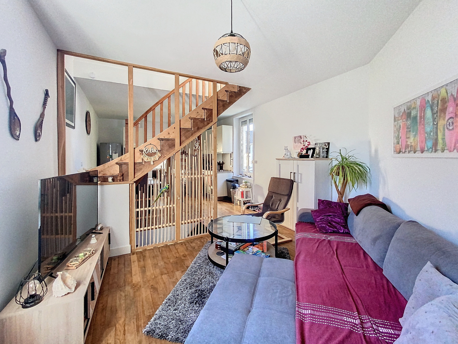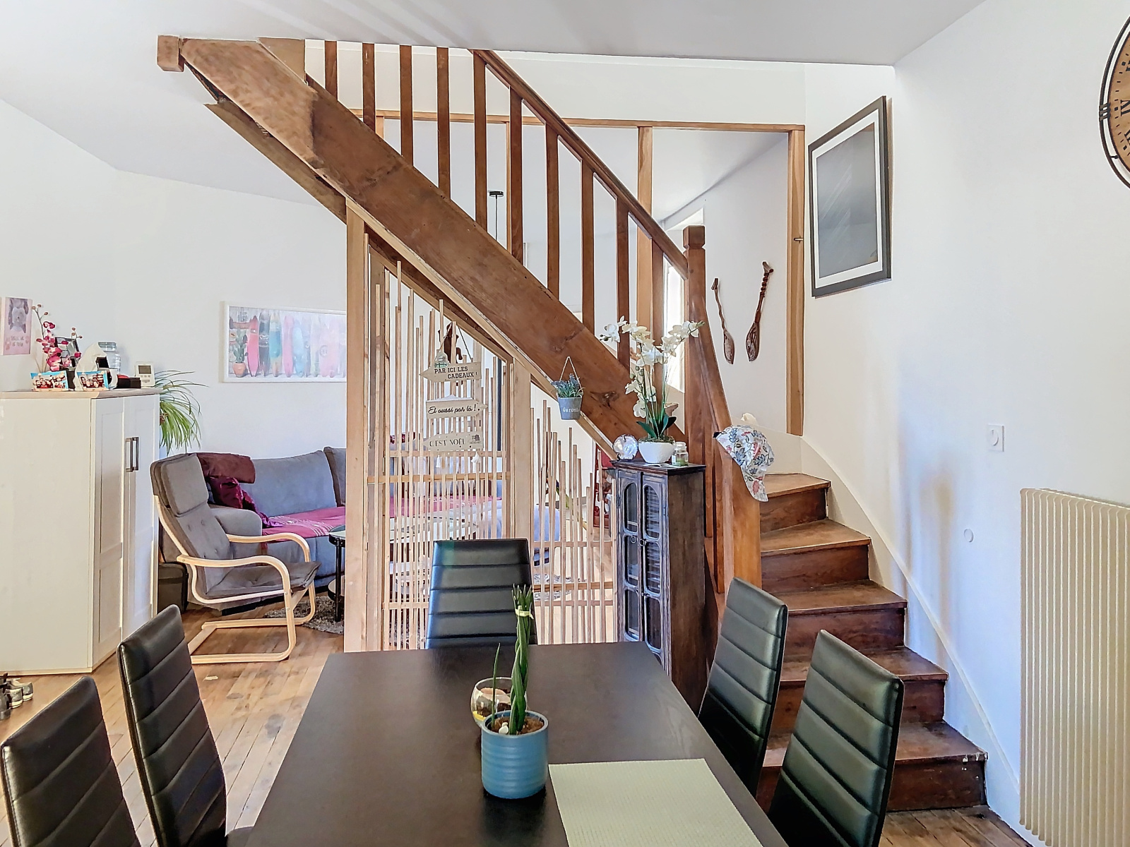 L’entrée donne accès à une magnifique une pièce de vie avec cuisine équipée et aménagée, un salon-séjour cosy, une salle de bain et des toilettes séparés, les deux escaliers ouverts desservent :