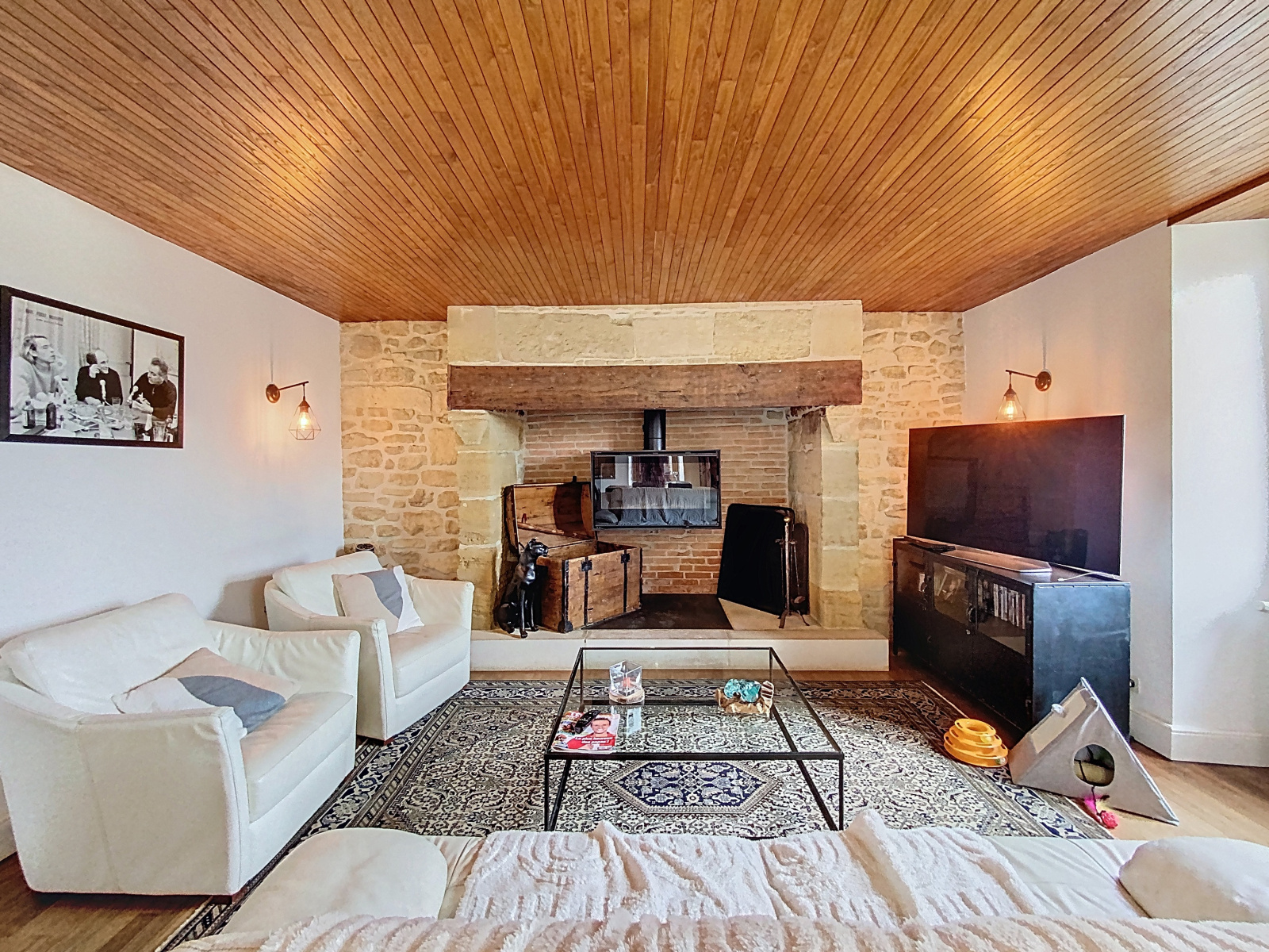Nous disposons de plain-pied, d’une belle entrée, d’un grand salon séjour, d’une cuisine, d’un WC et d'une grande buanderie-chaufferie avec accès à une grande et magnifique cave. Le séjour permet l’accès à un balcon et une terrasse couverte aussi cosy que fonctionnelle.