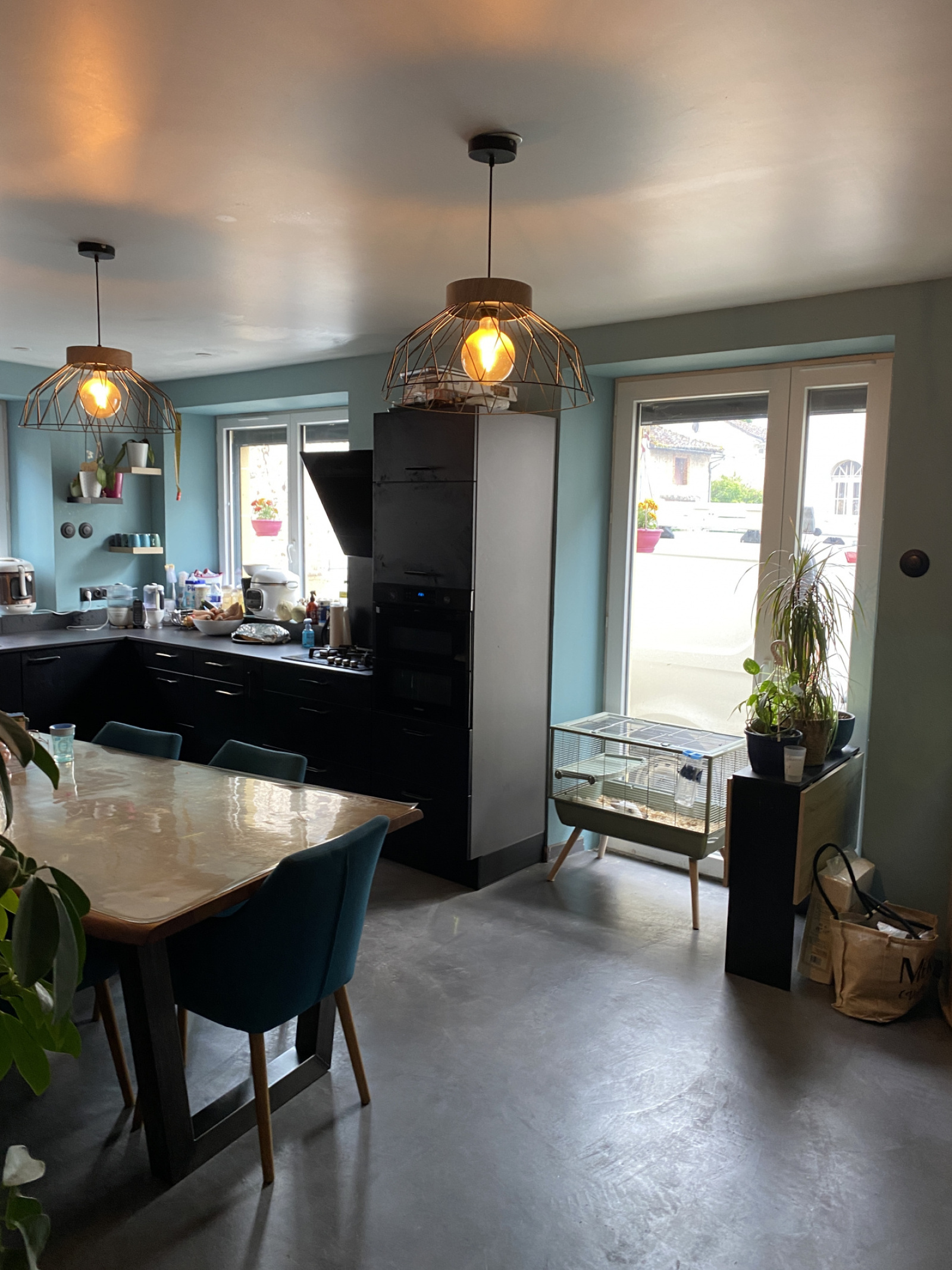 Elle se compose au RDC : d'une entrée couloir avec rangement, une cuisine équipée/aménagée ouverte sur la salle à manger lumineuse et un salon.
