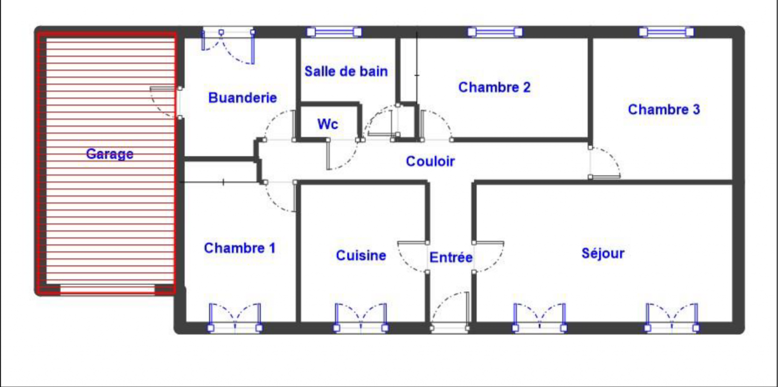 Vous y découvrirez une entrée avec à gauche une cuisine équipée et à droite, un salon/séjour de 21m². Un couloir dessert trois chambres dont deux avec penderie/dressing, chaque chambre faisant une dizaine de m², une salle de bains, des WC et une buanderie. Depuis la buanderie, vous accédez au garage de 20m² et au jardin à l'arrière de la maison. Chauffage électrique.