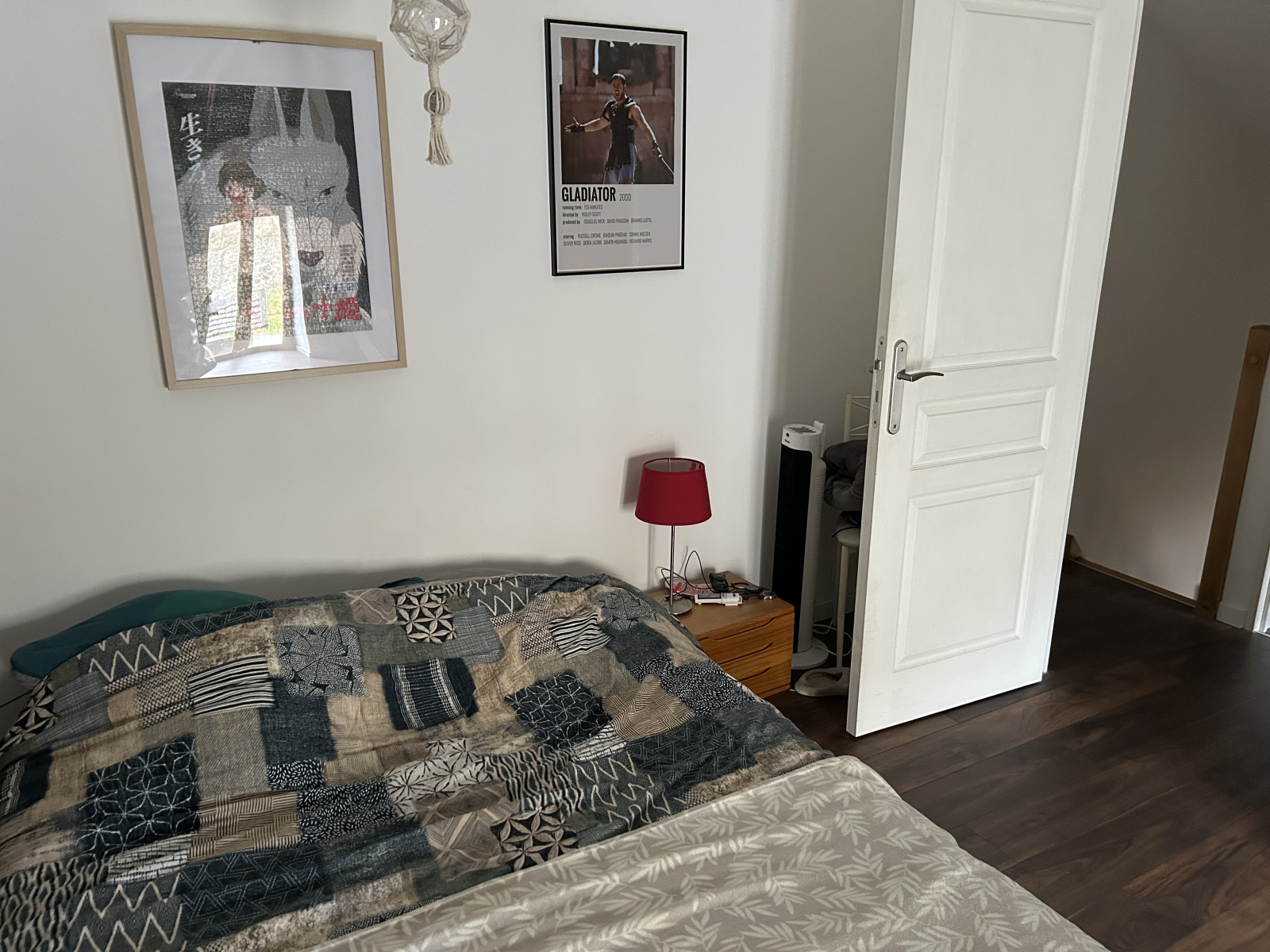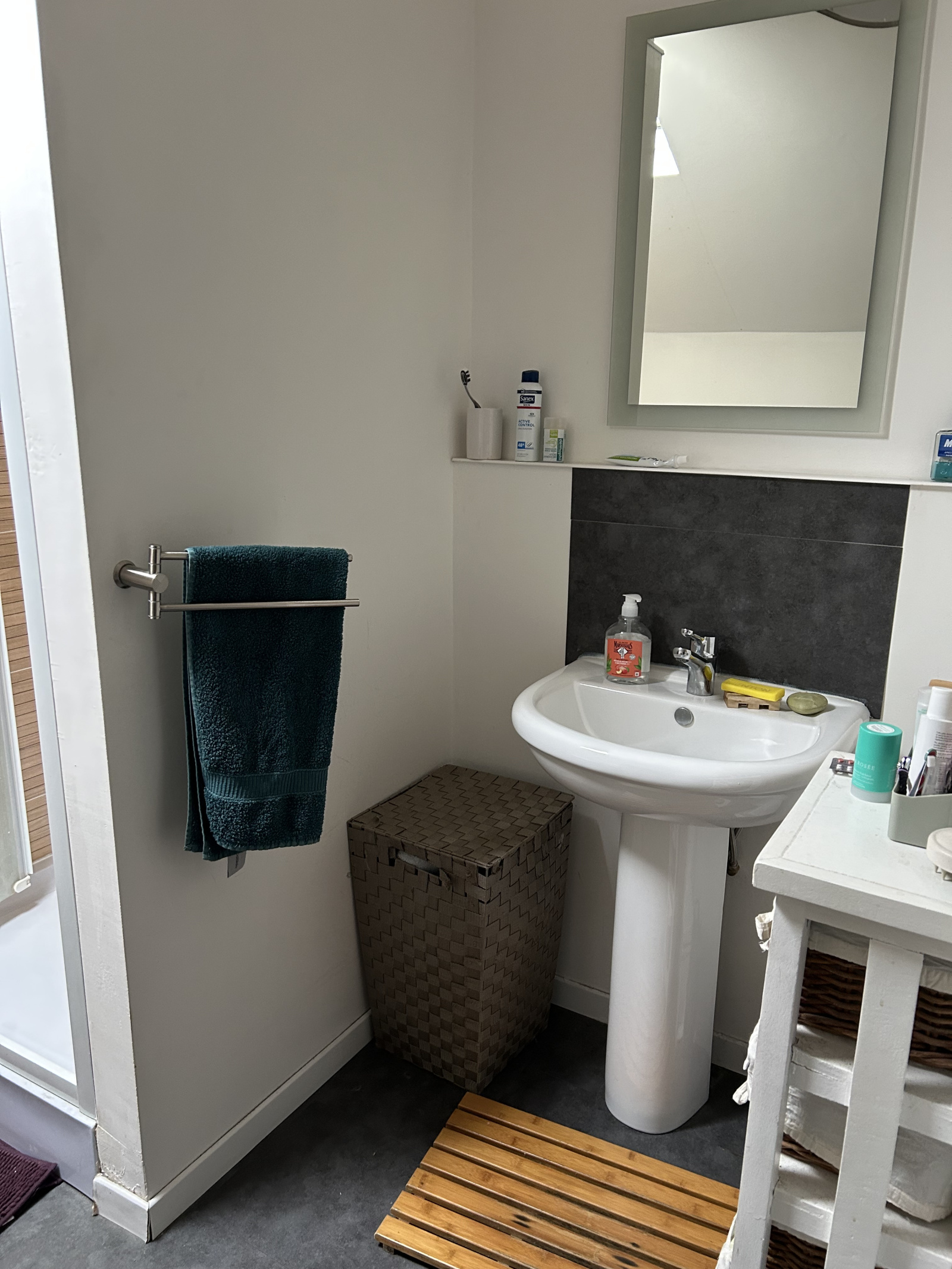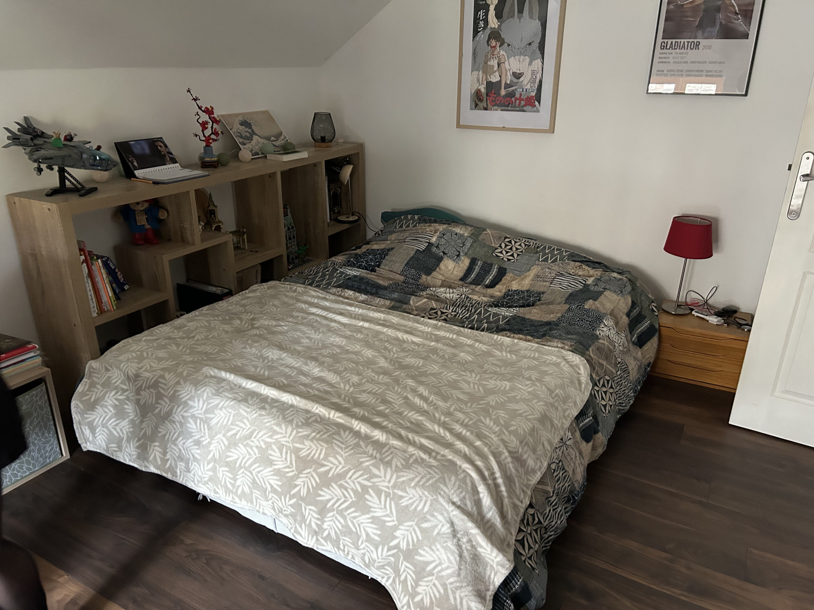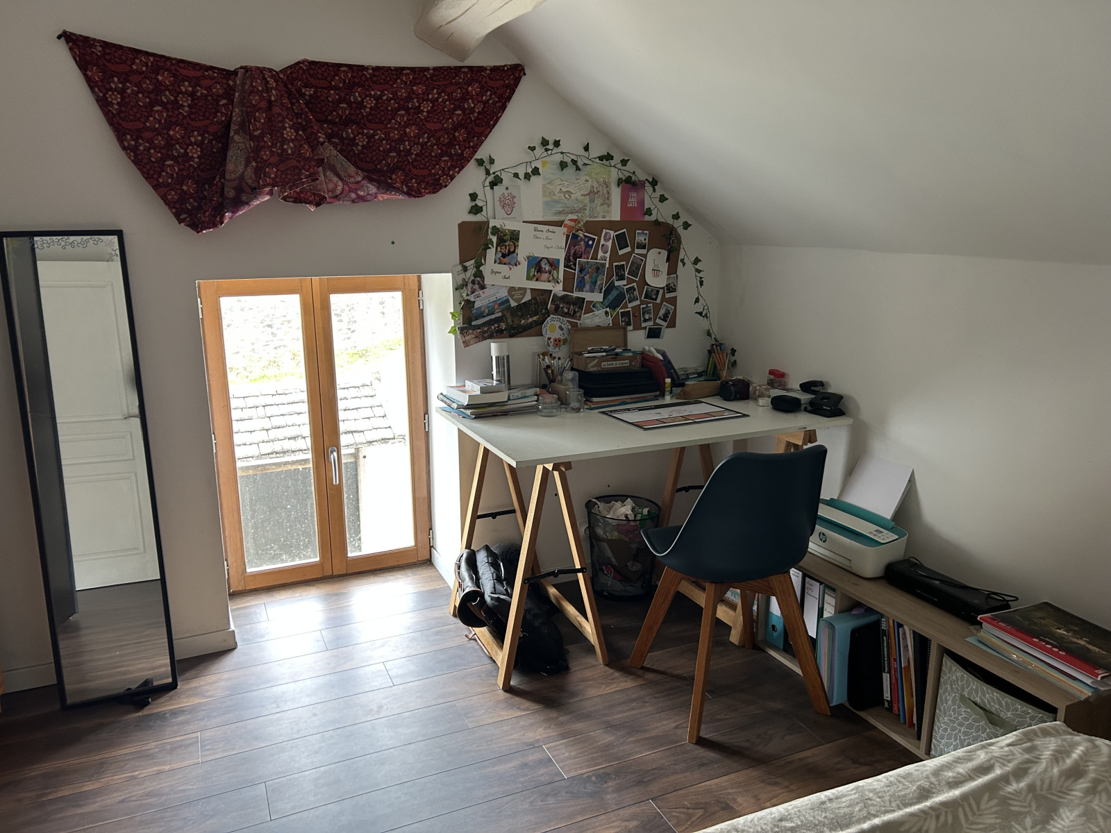 L'escalier droit vous mène à l'étage et à l'espace nuit avec sa chambre mansardée, sa salle d'eau moderne avec rangements. L'ensemble fait environ 60 m²... mais qu'on s'y sent bien !