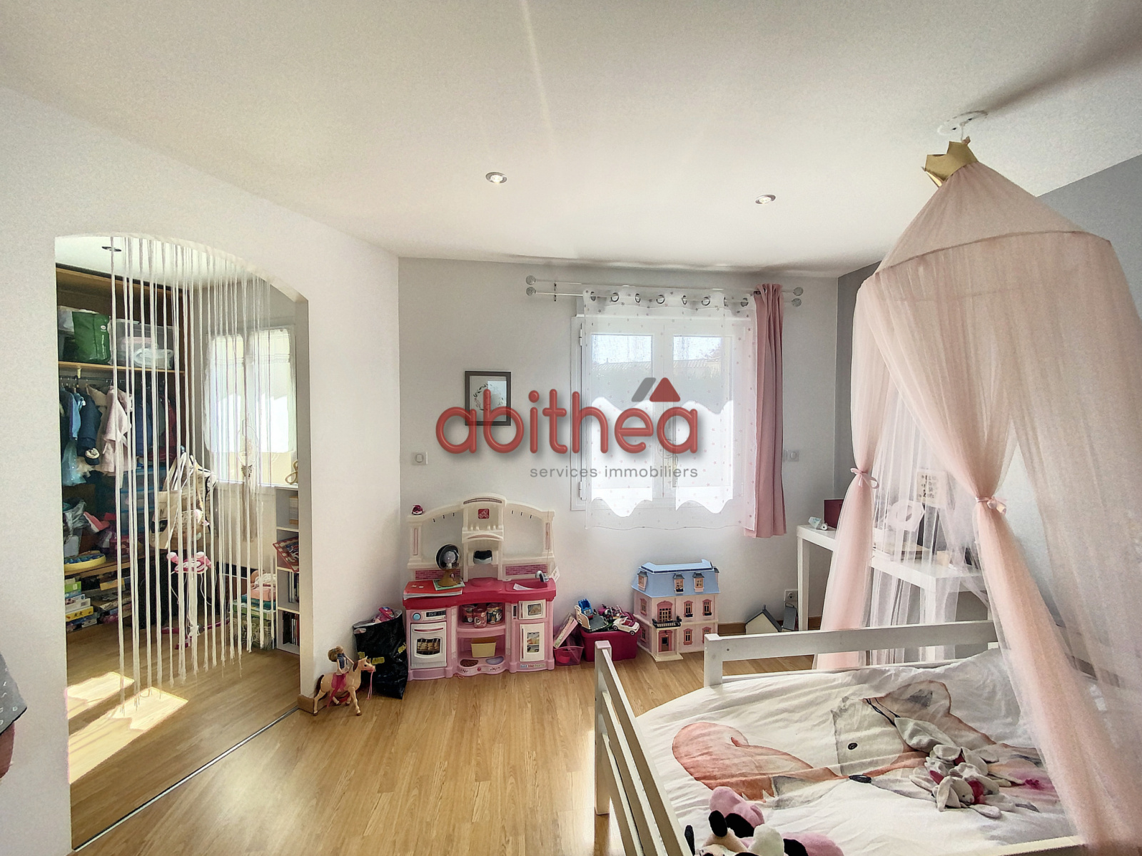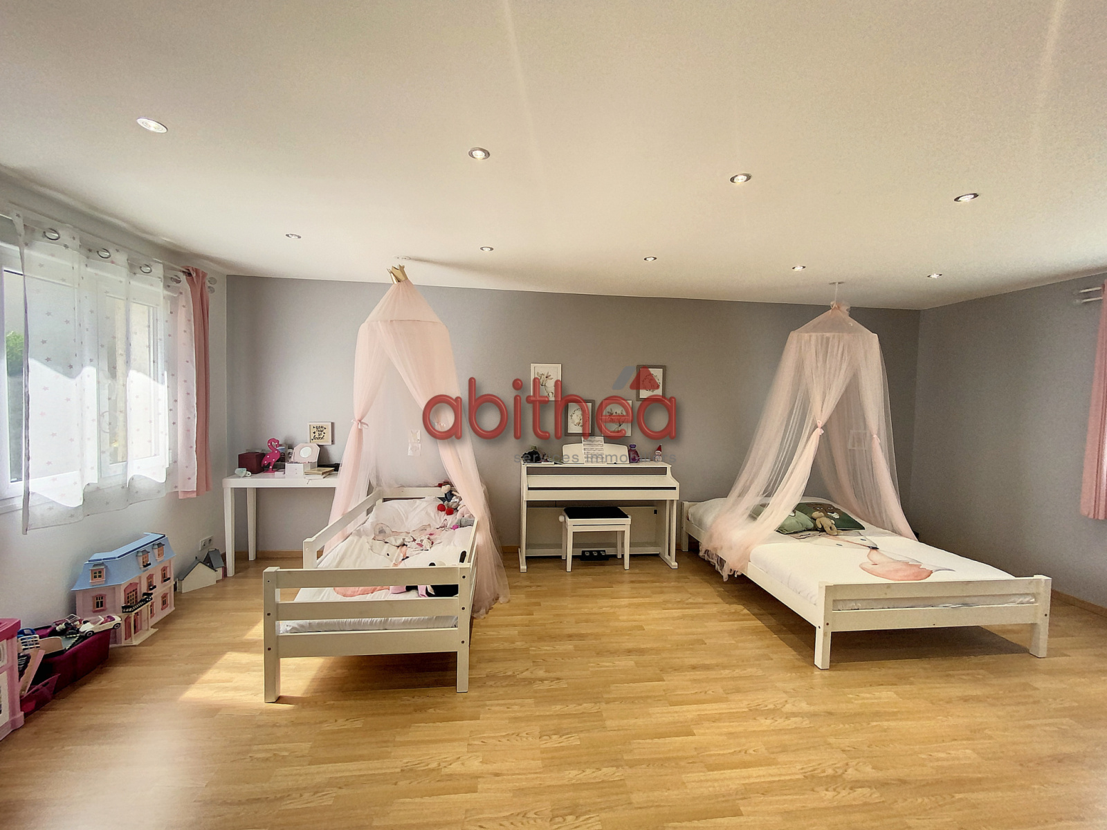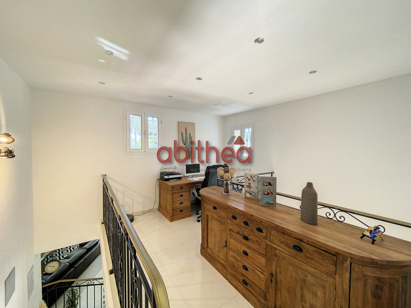 Nous accédons à l'étage par un magnifique escalier, et arrivons sur un palier de très belle taille desservant deux chambres et une salle de bain.