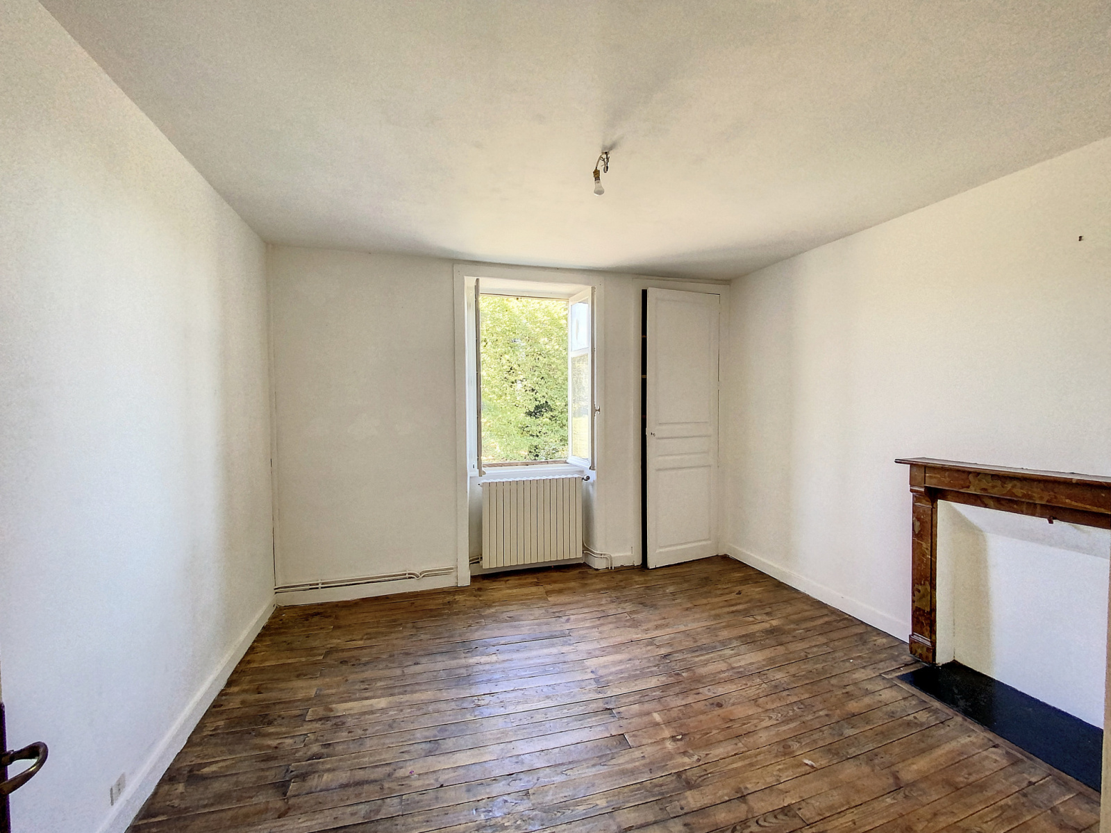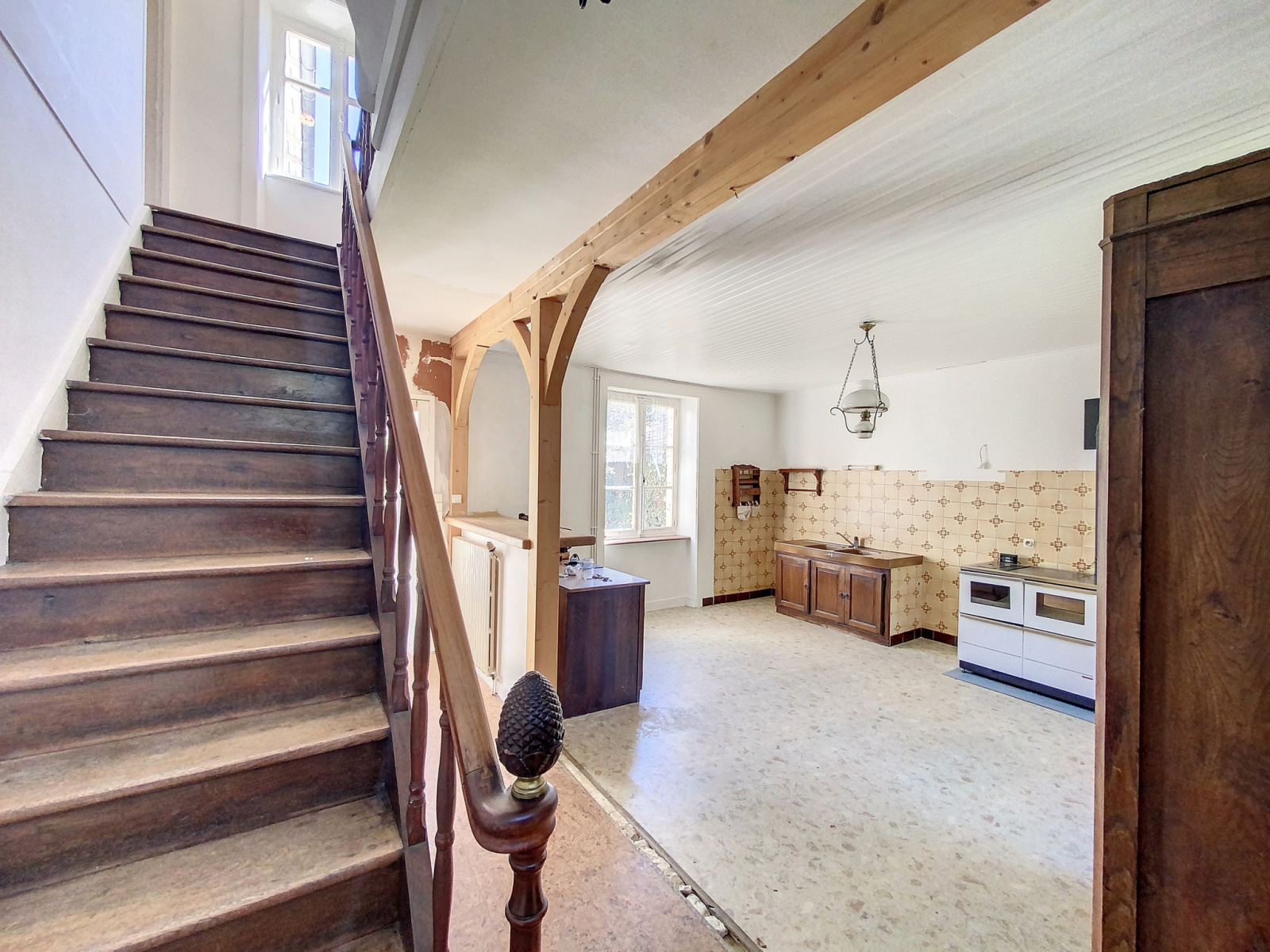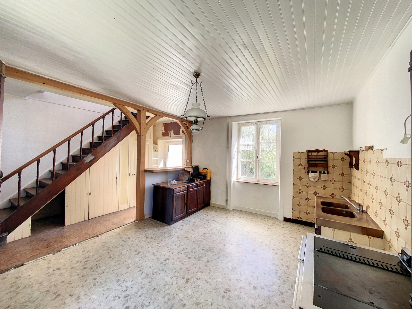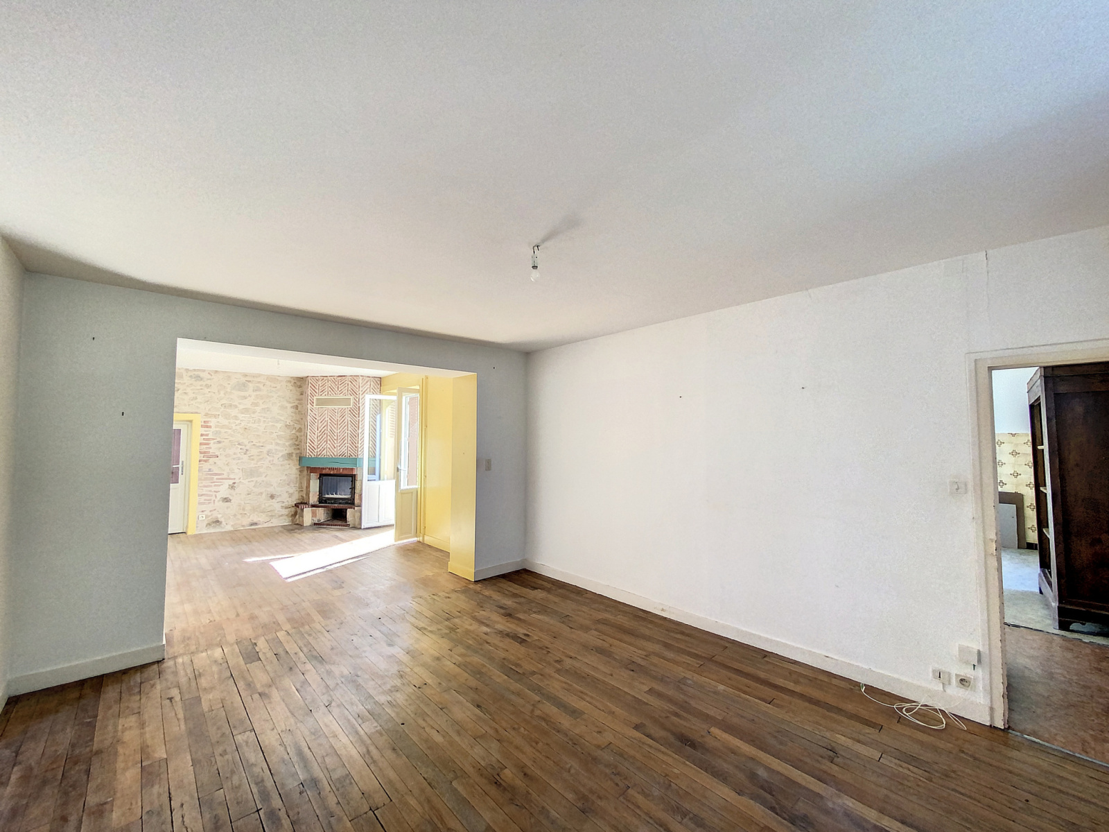 Le RDC est composé d’une belle entrée desservant de part et d’autre une cuisine à aménager, et un grand salon séjour lumineux et traversant, avec vue sur le terrain.