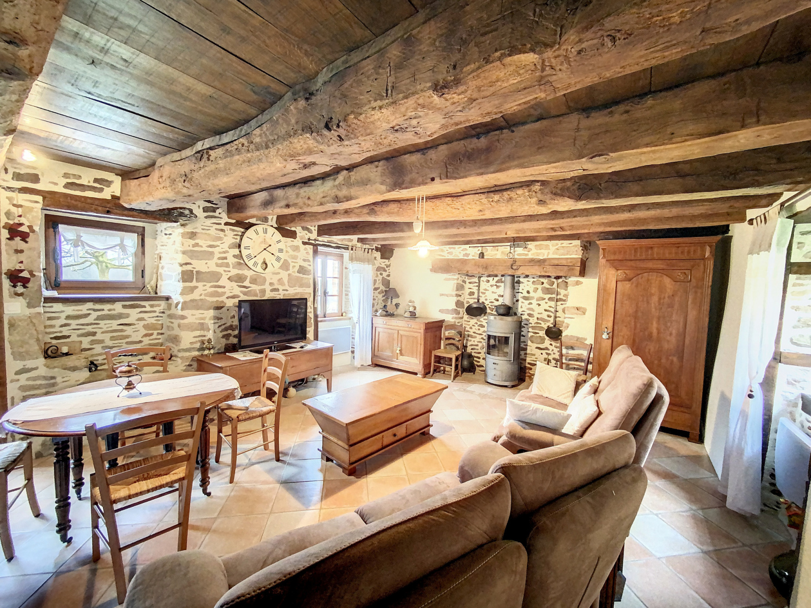 La maison dispose au RDC d’une belle pièce de vie avec son poêle a bois, une grande cuisine séparée, aménagée et équipée et des toilettes séparés.