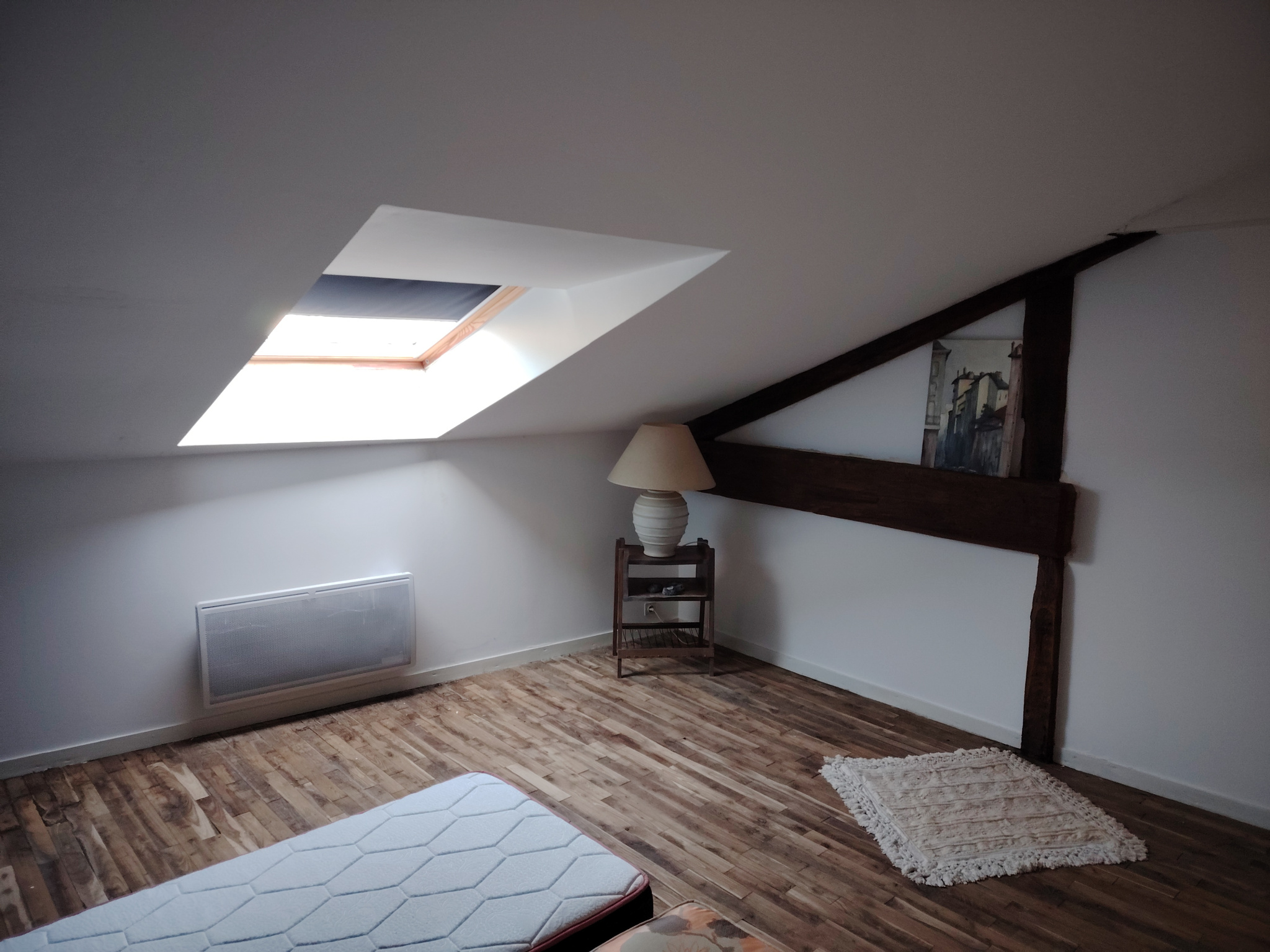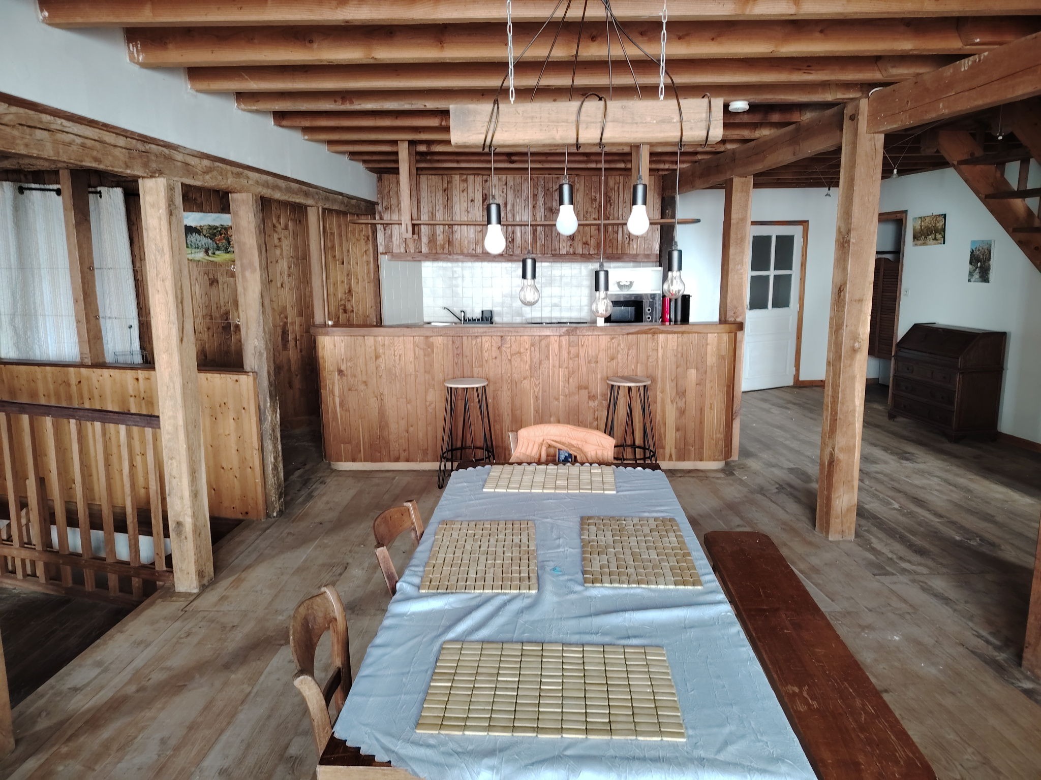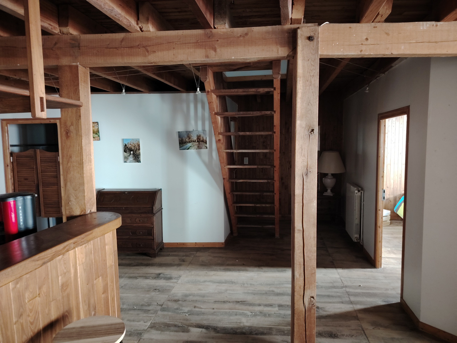 Au premier étage: une salle à manger-salon avec cuisine ouverte, une chambre, une salle de bain, un WC.